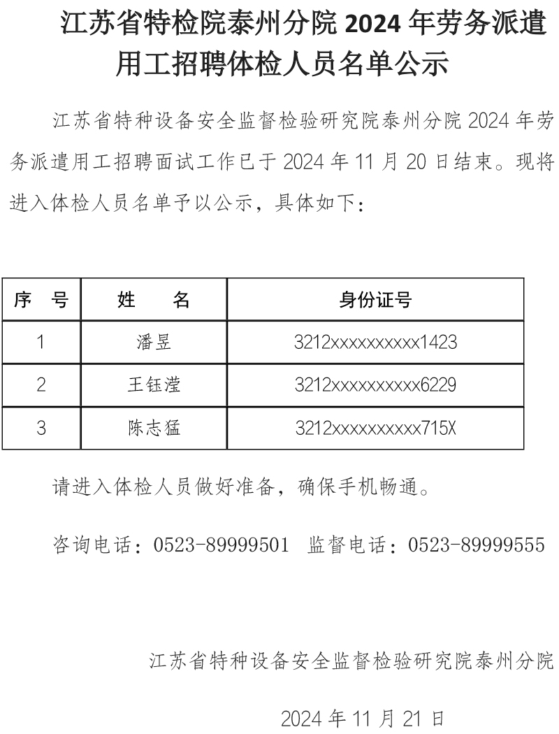 江苏省特检院泰州分院2024年劳务派遣用工招聘体检人员名单公示