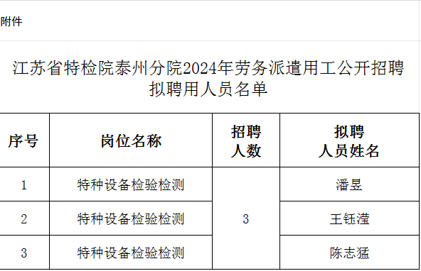 根据《江苏省特种设备安全监督检验研究院泰州分院2024年劳务派遣用工招聘公告》,经过初审、复审、面试、体检、考察等规定程序,潘昱、王钰滢、陈志猛等3名同志符合录用条件,现对拟录用人员名单予以公示(见附件)。