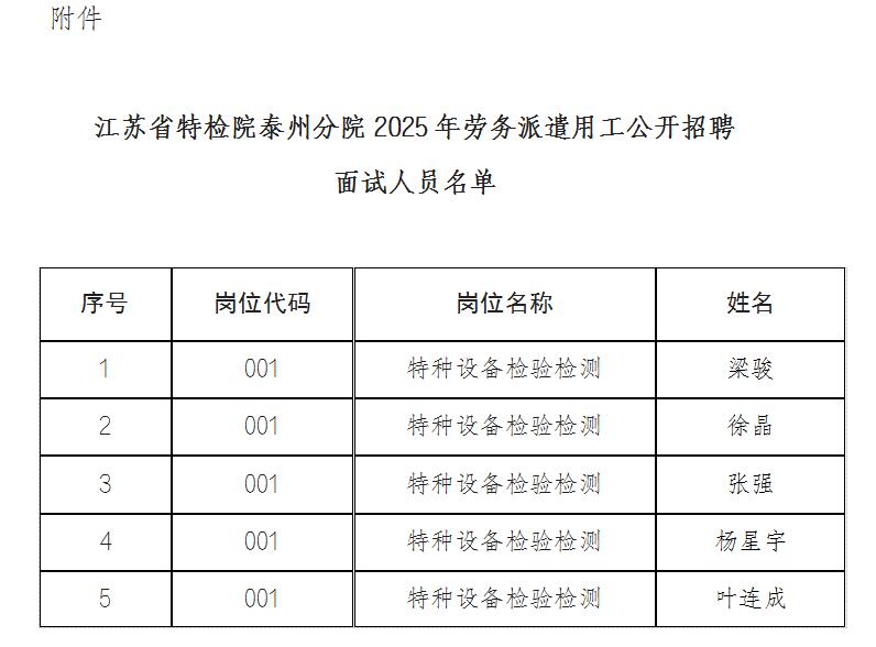 江苏省特检院泰州分院2025年劳务派遣用工人员公开招聘面试人员名单
