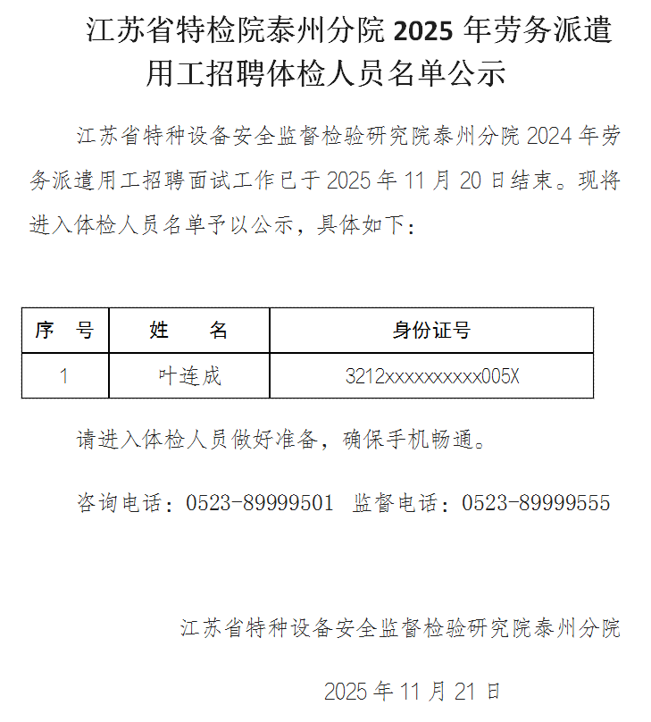 江苏省特检院泰州分院2025年劳务派遣用工招聘体检人员名单公示
